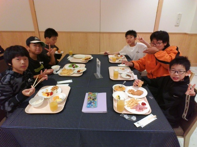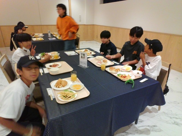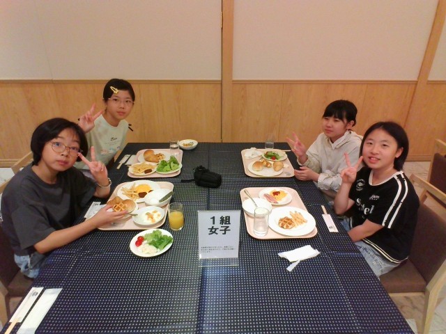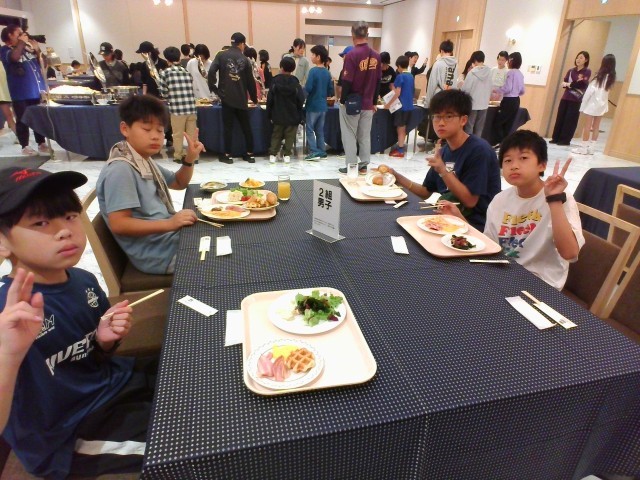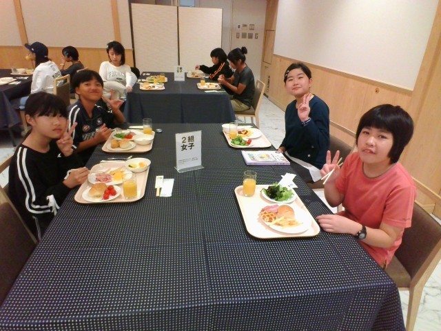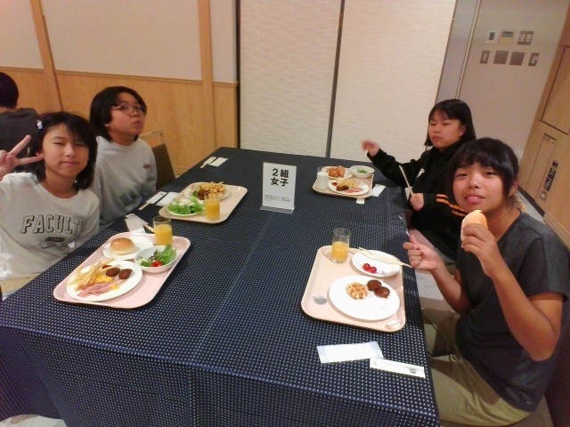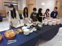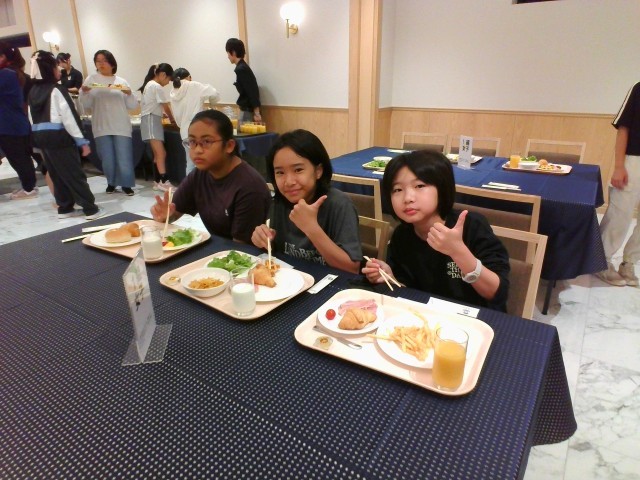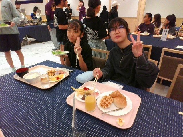 朝食の様子です。バイキング形式の料理を楽しんでいます。