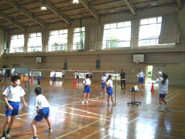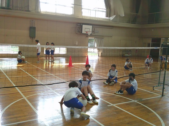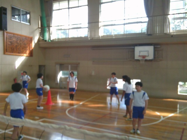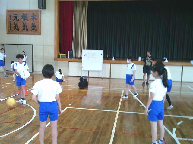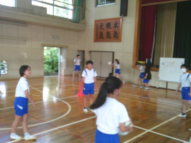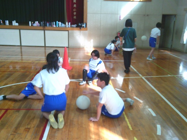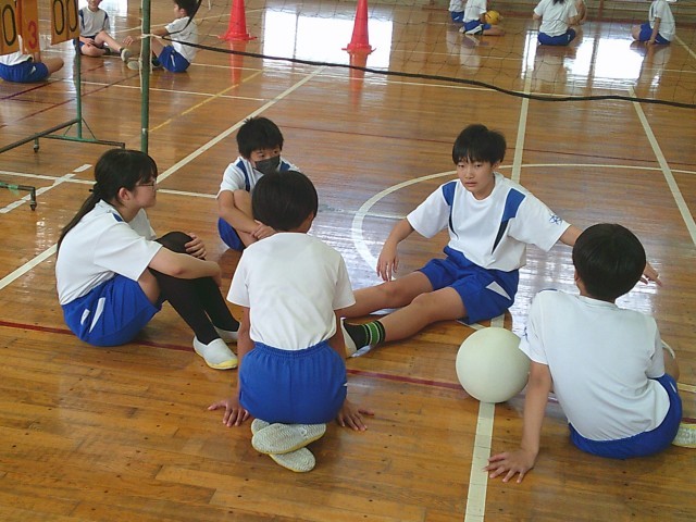 6年生の学習の様子です。両クラスで合同体育を行いました。チーム数が多くなり普段対戦したことのないグループとの対戦もありました。チーム内の練習の後、実際にゲームをしました。