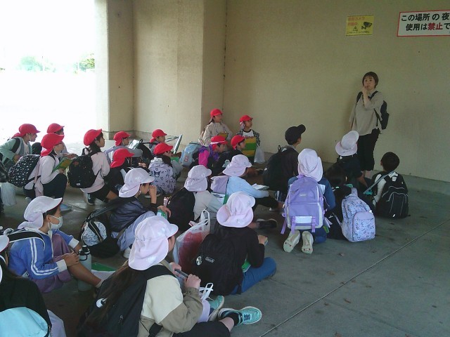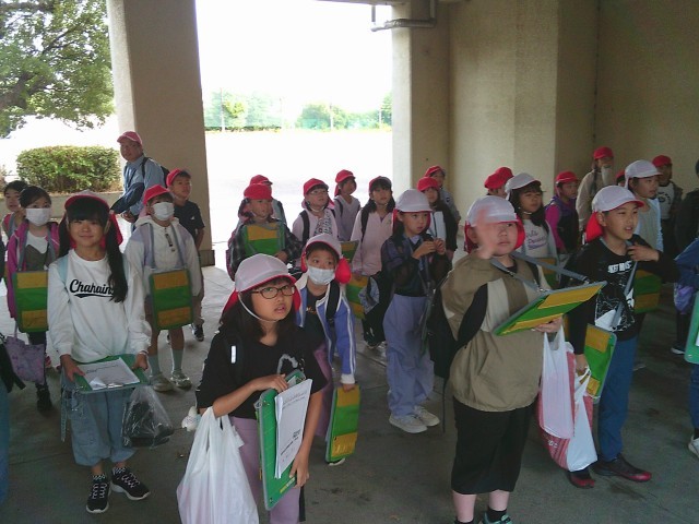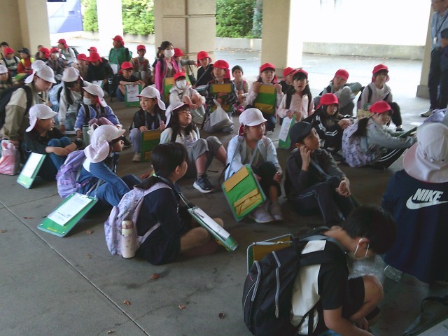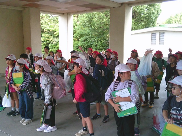 3年生は、沼津市内の社会科見学に出かけました。みかん選果場やひもの工場、御用邸公園などを見学してきます。ピロティーで出発式を行いました。