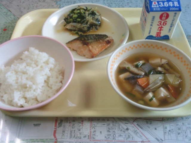 今日の給食は、「ご飯、牛乳、鯖のみそ焼き、わかめ入りおひたし、けんちん汁」でした。みんなで美味しくいただきました。