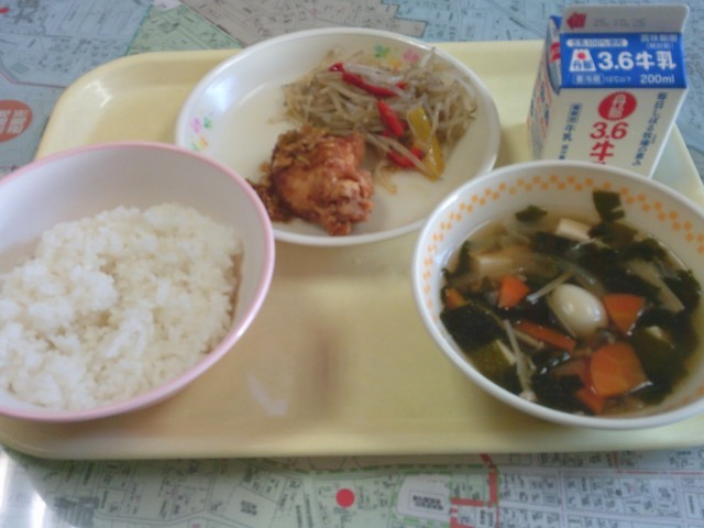 今日の給食は、「ご飯、牛乳、鶏の唐揚げ 薬味ソースかけ、もやしとパプリカの炒め物、わかめスープ」でした。みんなで美味しくいただきました。