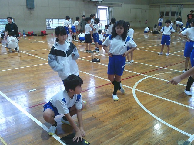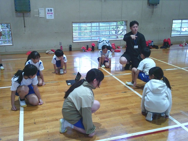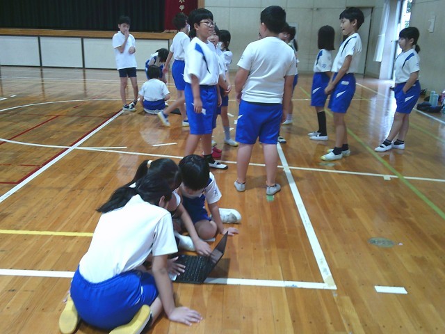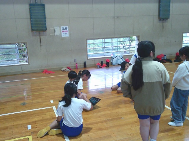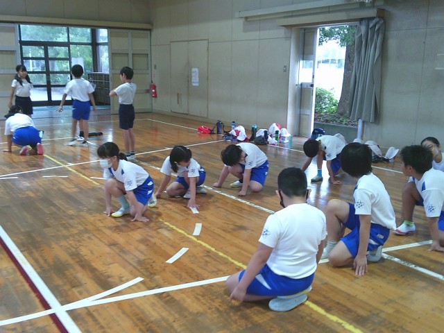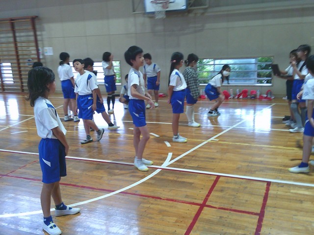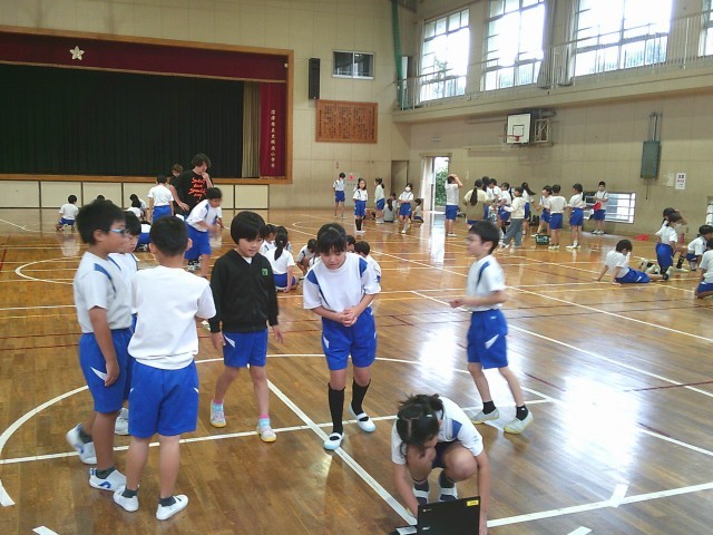 4年生の学習の様子です。今日から運動会に向けた練習がスタートしました。体育館では3・4年生が合同で体育を行い、ソーラン節「よっちょれ」の練習をしました。3年生は4年生のお兄さん、お姉さんから踊り方の指導を受けました。当日に向けて、よい踊りができるよう頑張っていきます。