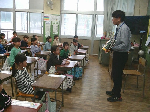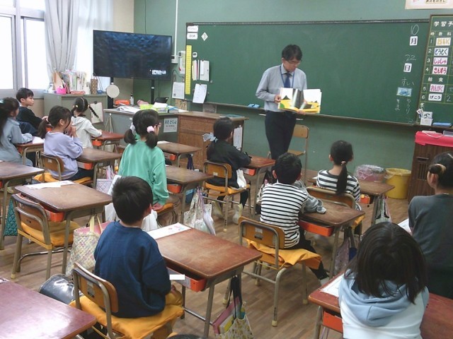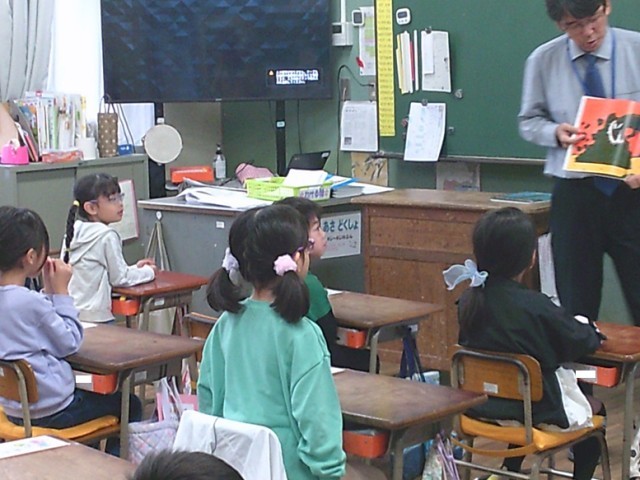 1年1組は、校長先生による朝の読み聞かせでした。みやにしたつやさんの「おまえうまそうだな」という本を読みました。みんな真剣に聞き入っていました。