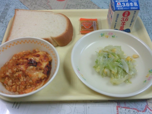 今日の給食は、「山型食パン、牛乳、ミートグラタン、ボイルドサラダ、みかんジャム」でした。みんなで美味しくいただきました。