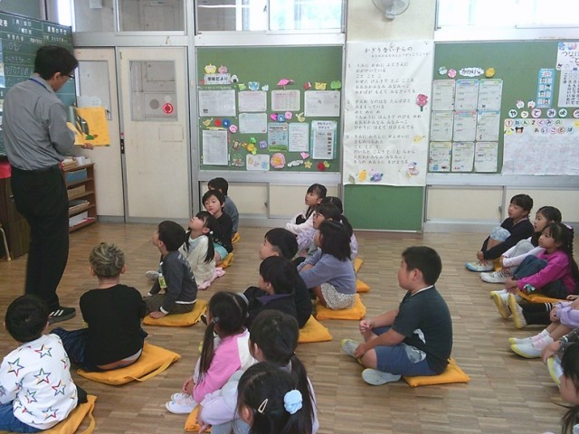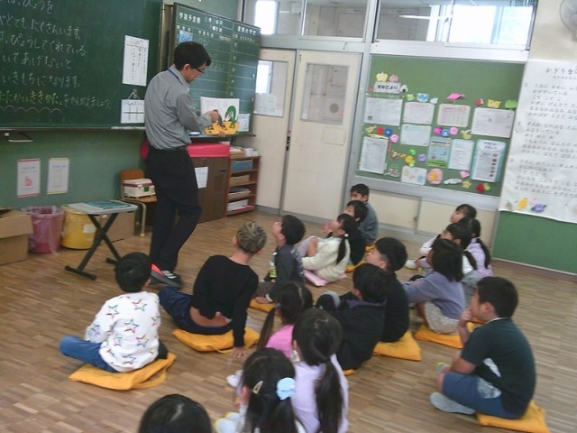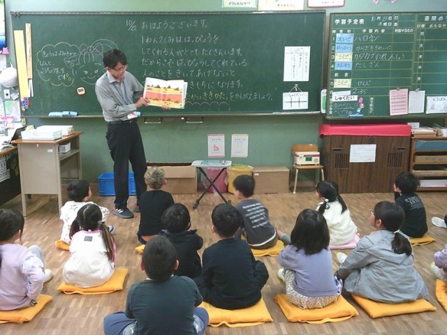 本日、教員による読み聞かせを行いました。1年2組は、校長先生による朝の読み聞かせでした。みやにしたつやさんの「おまえうまそうだな」という本を読みました。