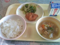今日の給食は、「ご飯、牛乳、ししゃもの天ぷら、じゃがいもの揚げがらめ、肉団子汁」でした。みんなで美味しくいただきました。