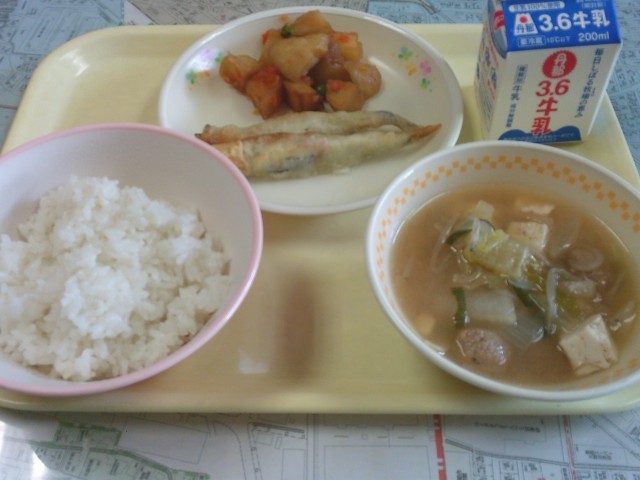 今日の給食は、「ご飯、牛乳、ししゃもの天ぷら、じゃがいもの揚げがらめ、肉団子汁」でした。みんなで美味しくいただきました。