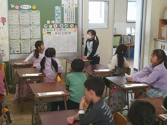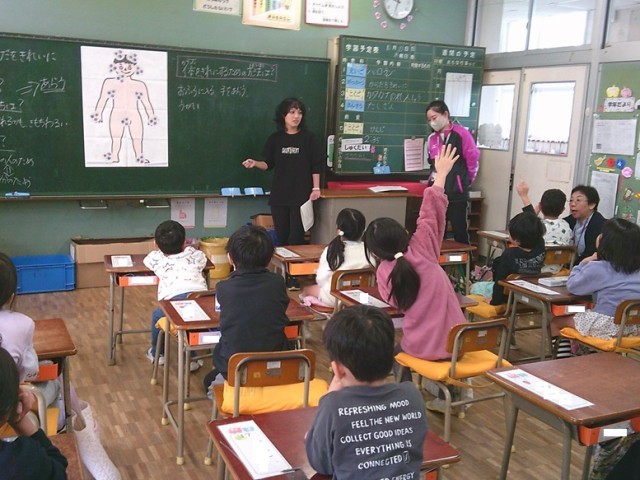 1年生は、養護教諭と学級担任が「からだをきれいに」というテーマで保健の学習を行いました。体をきれいにするための方法について話し合いました。