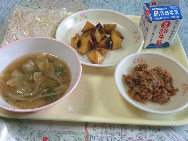 今日の給食は、「中華麺(担々麺)、牛乳、大学いも」でした。みんなで美味しくいただきました。