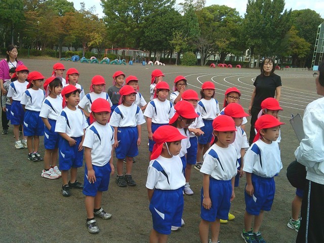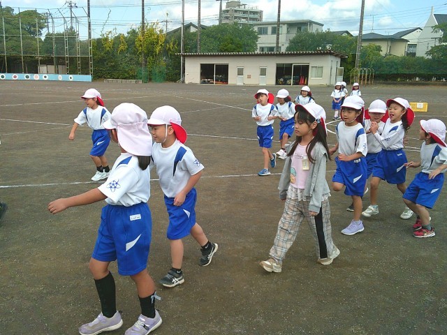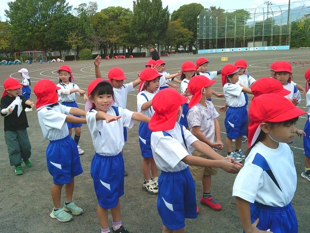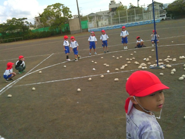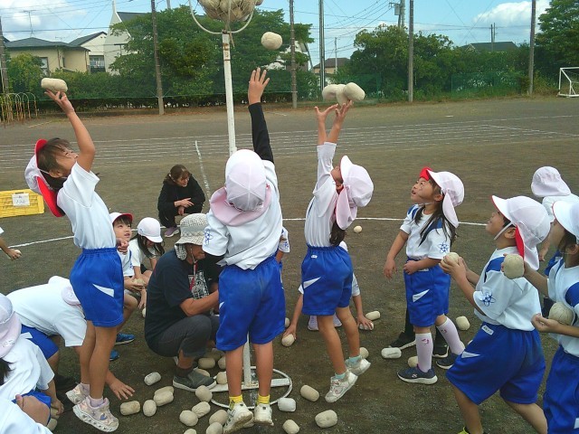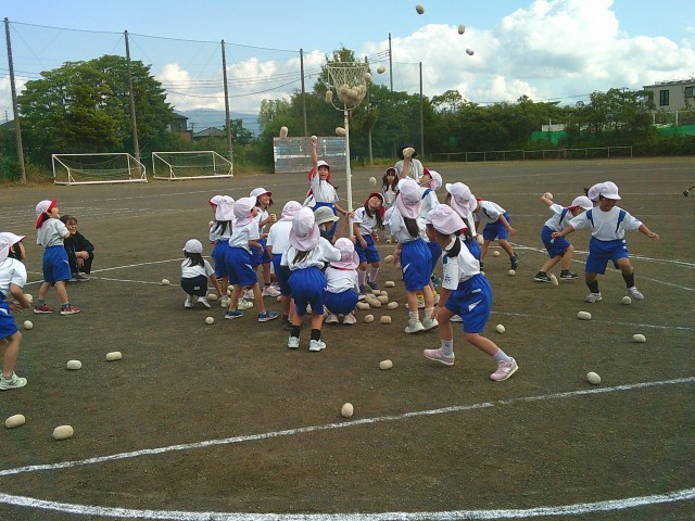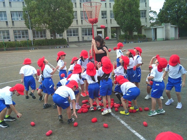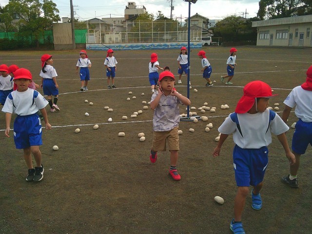 1年生の学習の様子です。3クラス合同で体育を行いました。玉入れの練習では、集合の仕方や終了後の確認などをした後、実際に3クラスで対戦してみました。