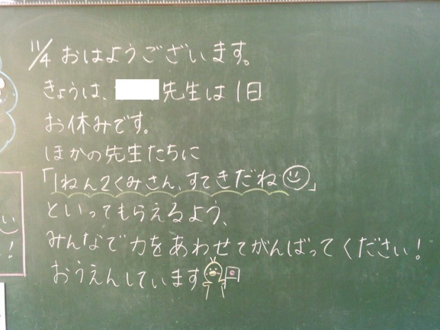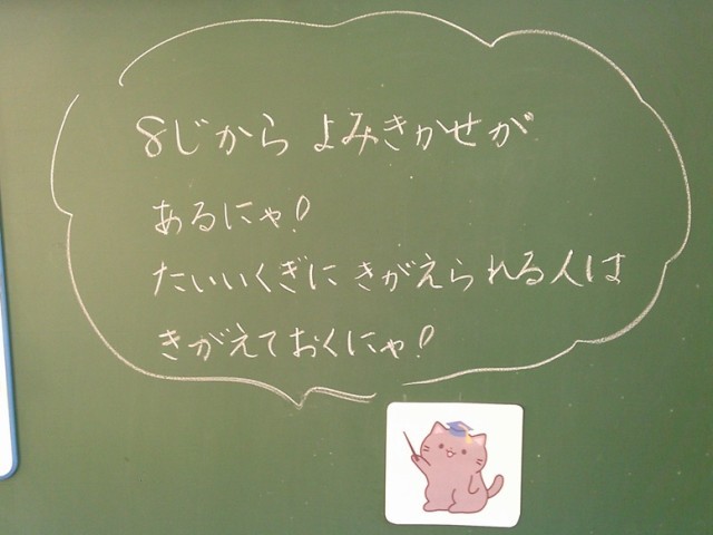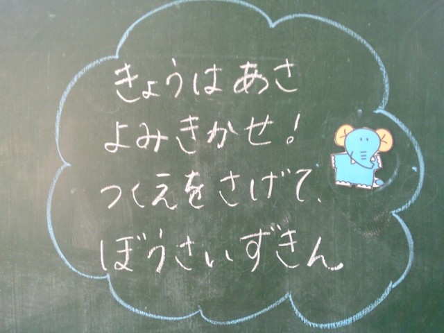 学級担任が黒板メッセージを用意して、子供たちの登校を待ちます。今日は読み聞かせがあります。