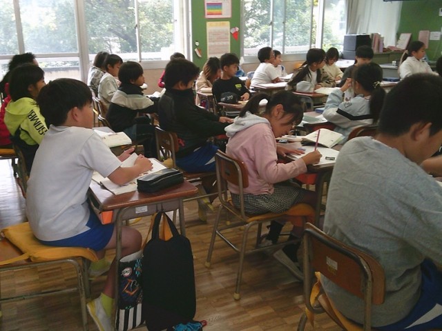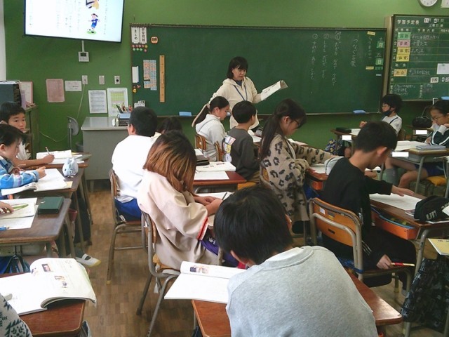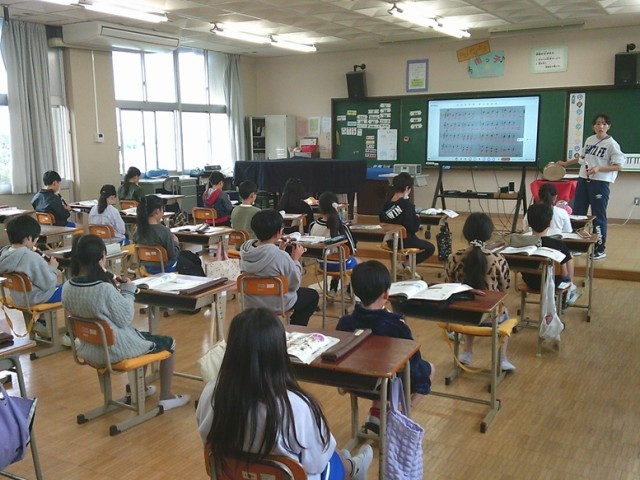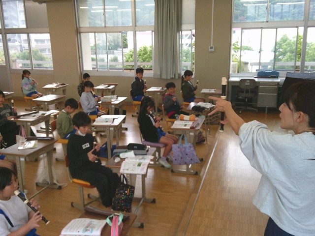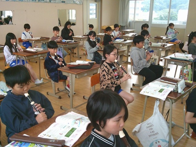 4年生の学習の様子です。両クラスとも友達と対話しながら活動を進めていました。音楽では指使いに気をつけながら、リコーダーで演奏練習をしていました。