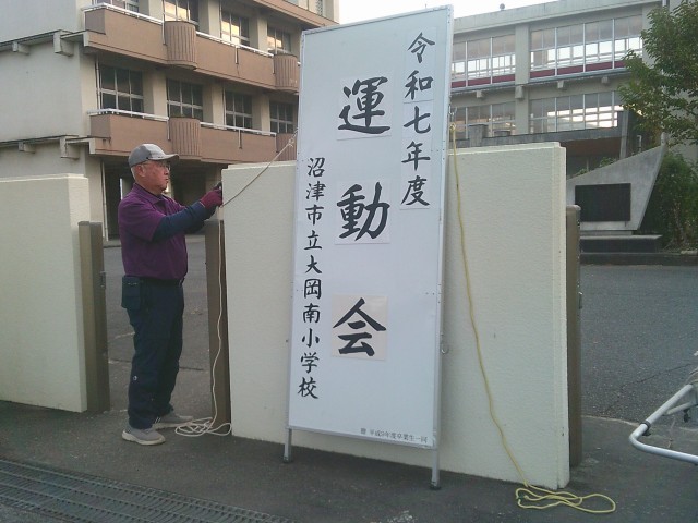 本日、第44回大岡南小学校運動会を開催させていただきます。保護者の皆様、地域の皆様、お子様へのご声援をよろしくお願いします。教職員が最後の準備をして、子供たちを迎え入れる体制にします。
