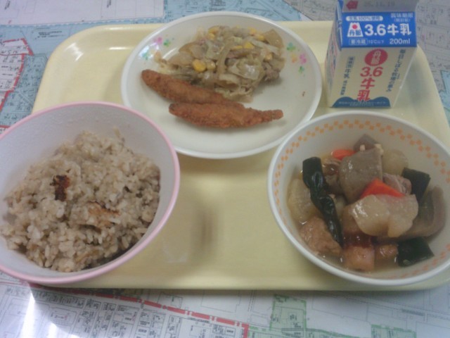 今日の給食は、「さくら飯、牛乳、煮込みおでん、きびなごフライ、キャベツとツナの炒め物」でした。みんなで美味しくいただきました。