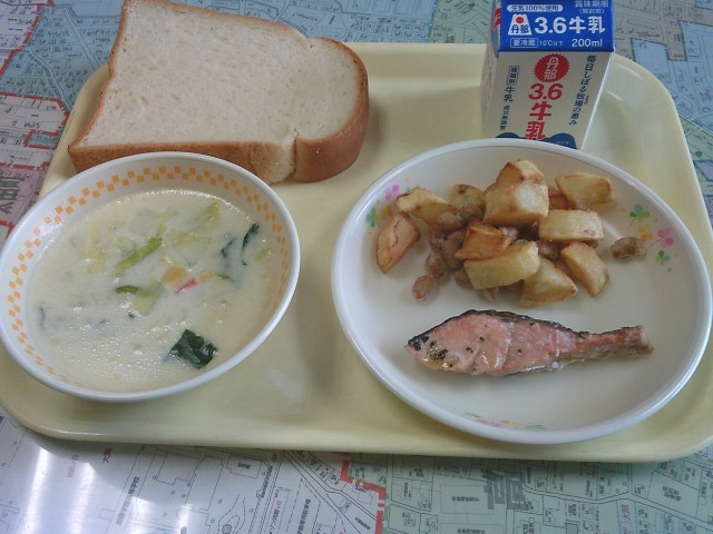 今日の給食は、「山型食パン、牛乳、鮭のハーブ焼き、じゃがいもと大豆の唐揚げ、ミルクスープ」でした。みんなで美味しくいただきました。