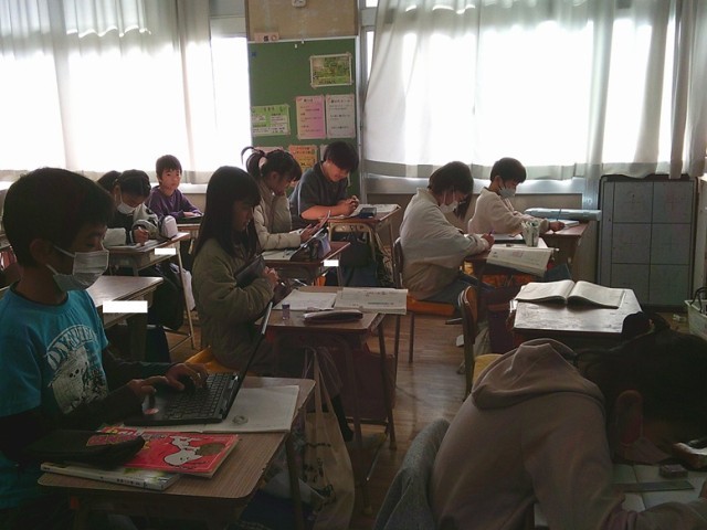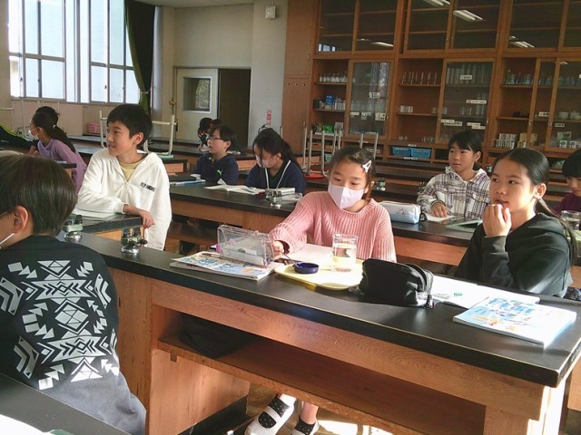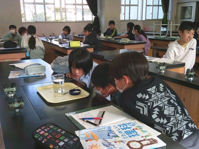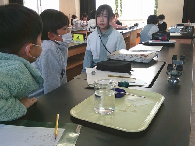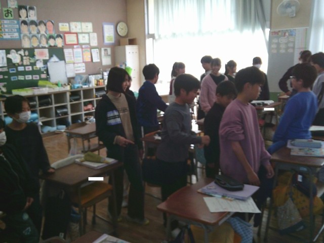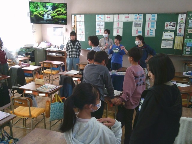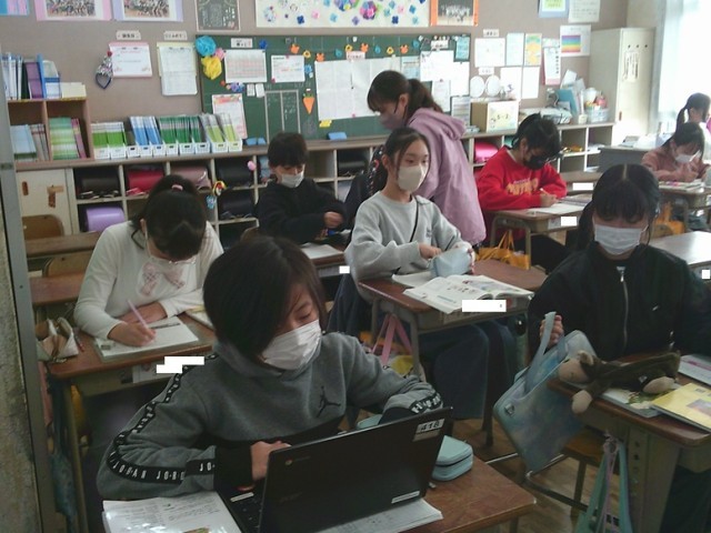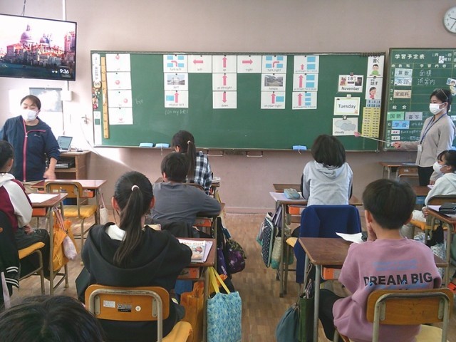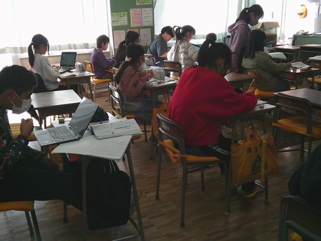 5年生の学習の様子です。3クラスとも学習課題解決に向け、真剣に取り組んでいました。英語では「道案内」の活動で、ALTの「Go Straight(まっすぐ進んで)」「Turn right(右に曲がって」などの英語を聞き、指示どおりに教室内を歩いていました。