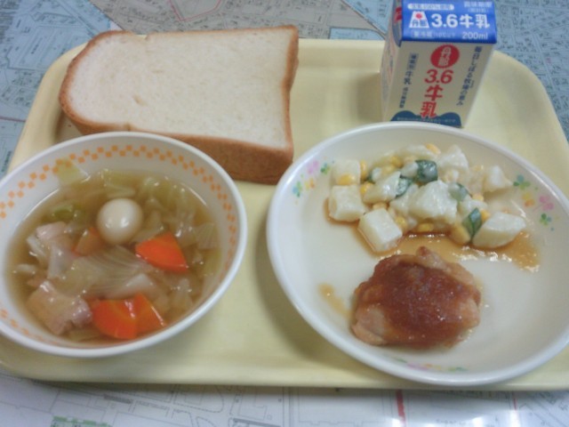 今日の給食は、「山型食パン。鶏肉のバーベキューソースかけ、マセドアンサラダ、うずらの卵と野菜のスープ」でした。みんなで美味しくいただきました。