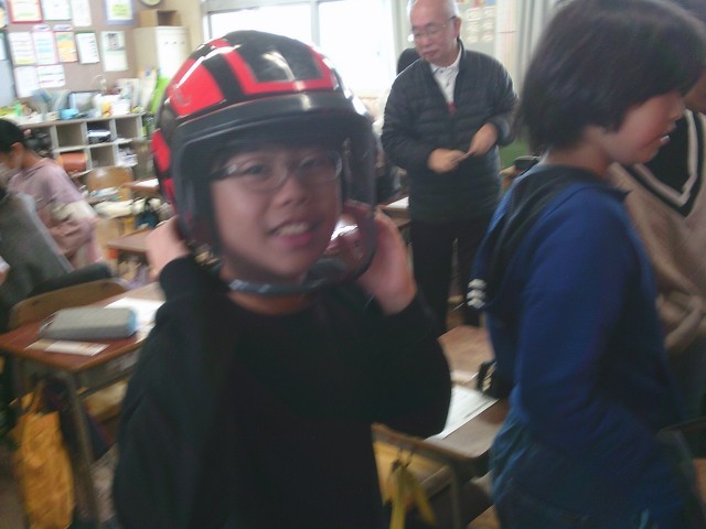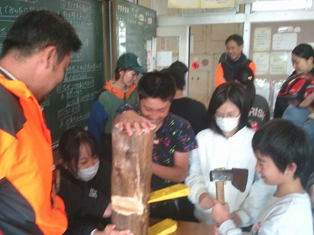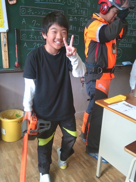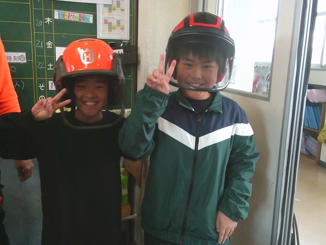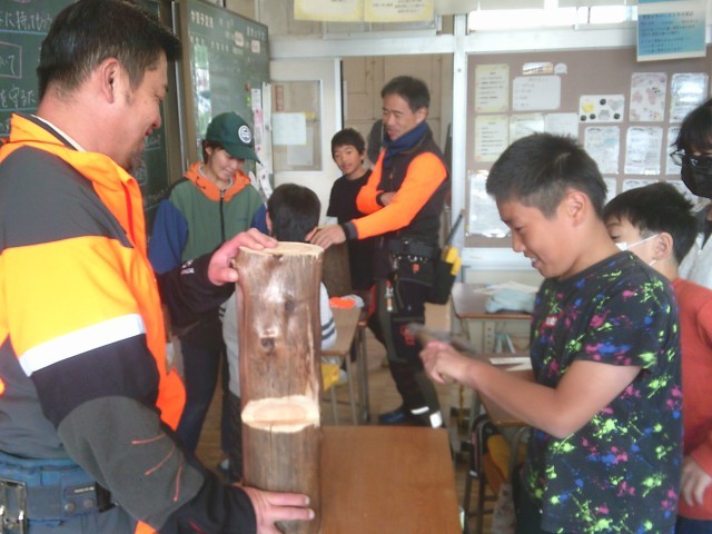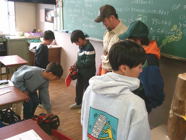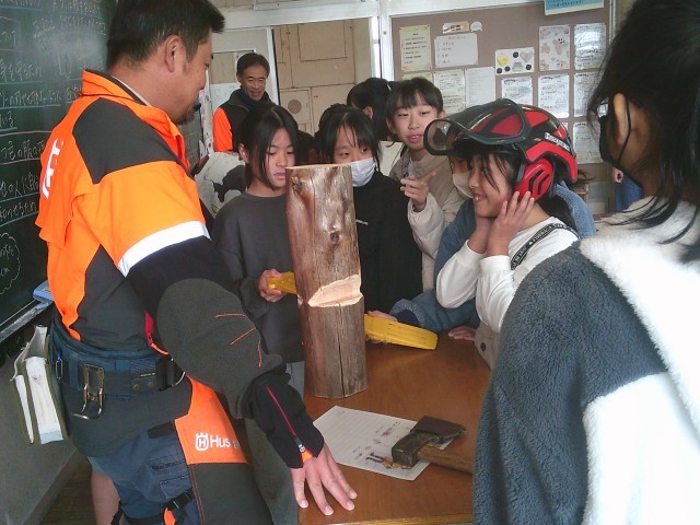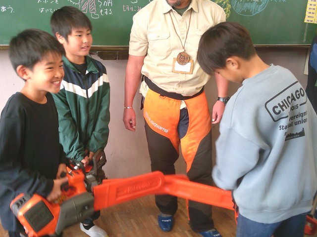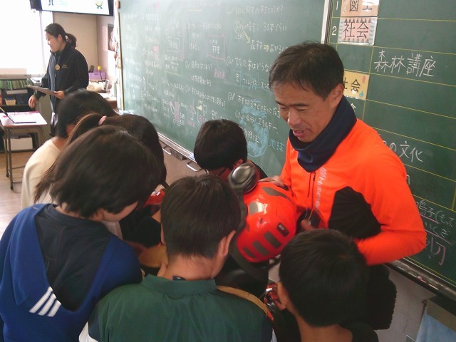 森林ESD出前授業終了後の休み時間に、ゲストティーチャーと触れあう機会をもちました。森プロの仕事道具を実際に装着したり、小道具の使い方についてレクチャーを受けたりしました。
