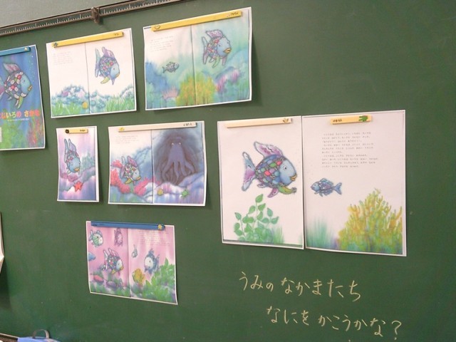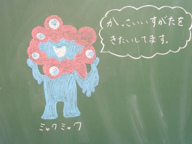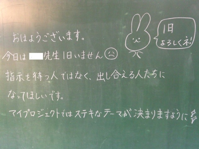 学級担任が黒板メッセージを用意して、子供たちの登校を待ちます。今日、出張で出かけている2人の学級担任もメッセージを残していました。