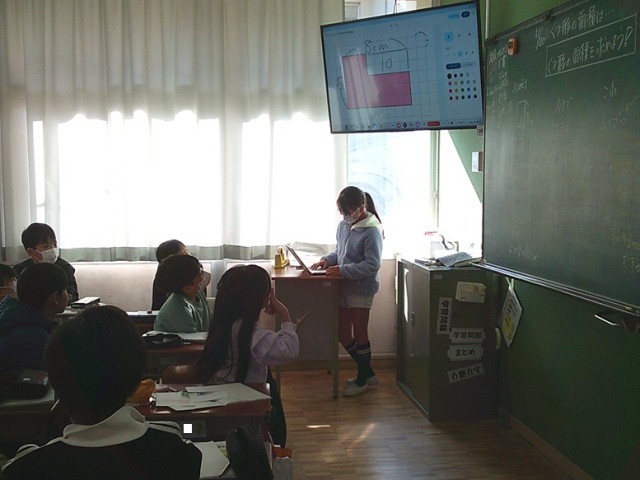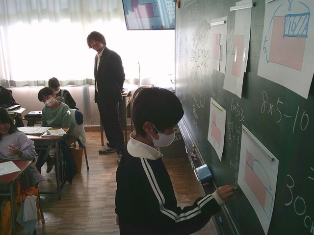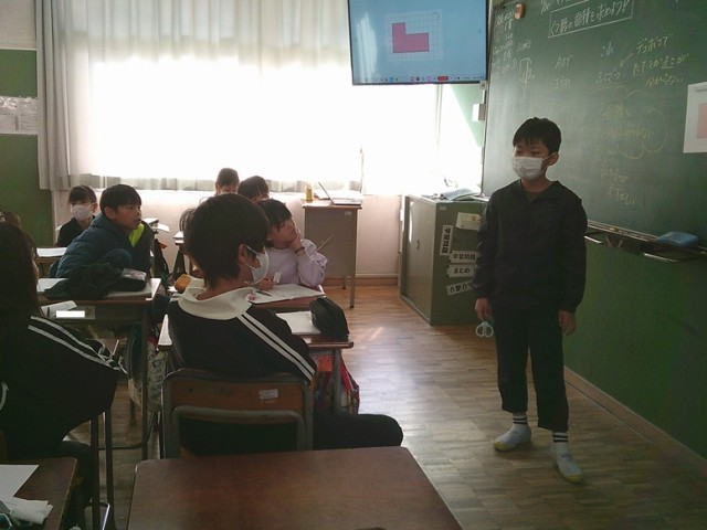 4年生は算数で「広さの表し方や求め方を調べよう」という学習を行っています。今日は、L字型の形の面積の求め方について、自分なりの考えをもち、友達と意見交換しました。なお、この時間は教員の指導力向上を目的として、数名の教員が授業を参観しました。また沼津市教職員研修センターより研修アドバイザーを招聘し、授業後にアドバイスをいただきました。