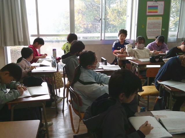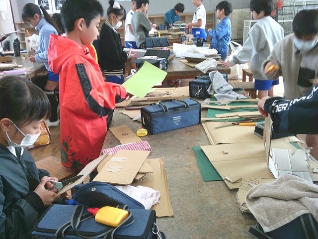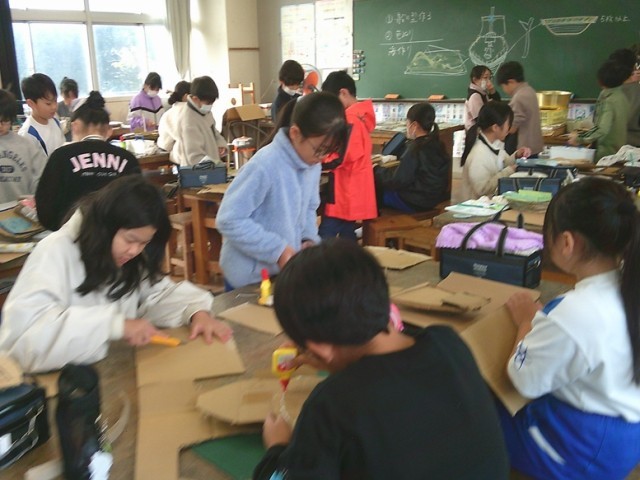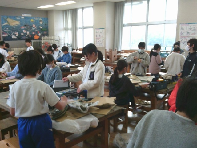 4年生の学習の様子です。両クラスとも集中して学習に取り組んでいました。図工では段ボールを使ったオリジナルの船作りを行っていました。