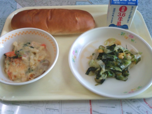 今日の給食は、「りんご入りパン、牛乳、チキンマカロニグラタン、海藻サラダ」でした。みんなで美味しくいただきました。