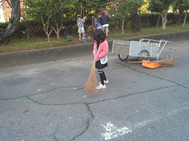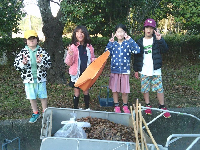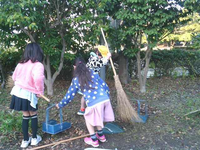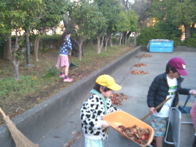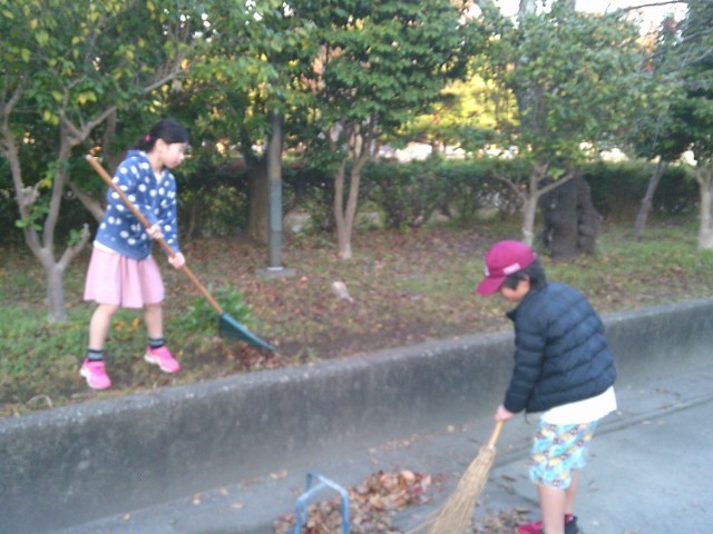 清掃ボランティアの子供たちが落ち葉掃きをしています。本当によく頑張っていました。ありがとうございました。