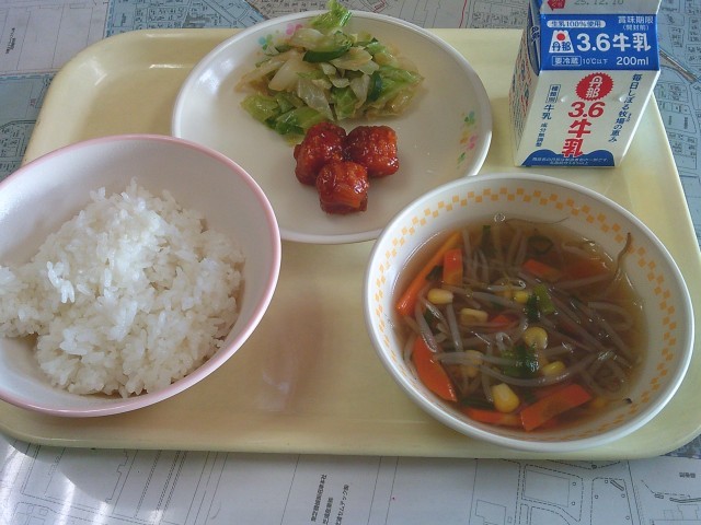 今日の給食は、「ご飯、牛乳、ホキのチリソースかけ、ボイルドサラダ、春雨スープ」でした。みんなで美味しくいただきました。