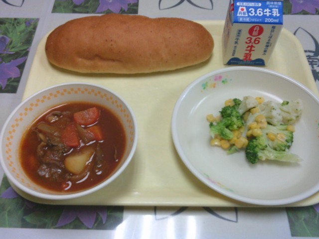 今日の給食は、「玄米入りパン、牛乳、ビーフシチュー、花野菜サラダ」でした。みんなで美味しくいただきました。