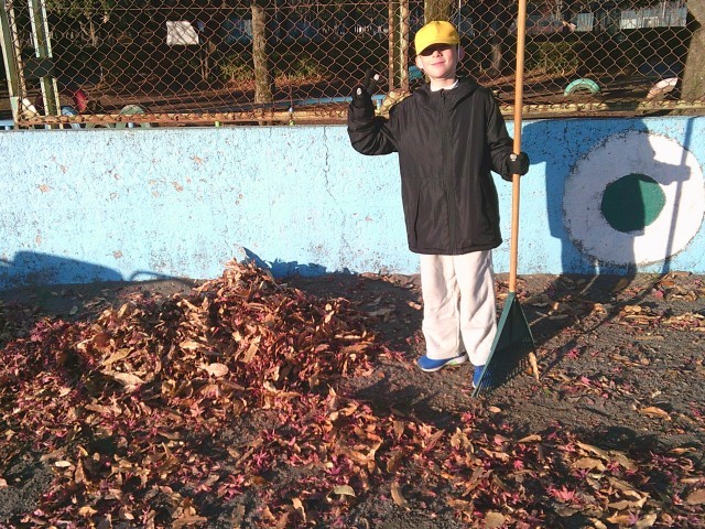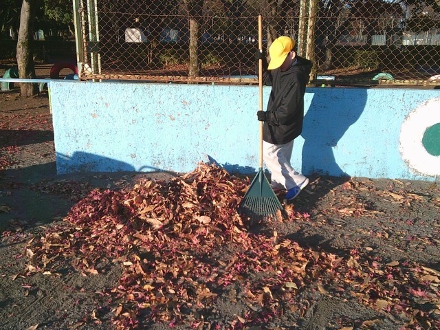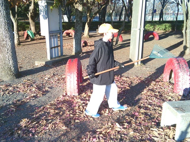 清掃ボランティアの子供たちが落ち葉掃きをしています。本当によく頑張っていました。ありがとうございました。
