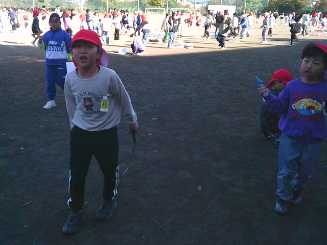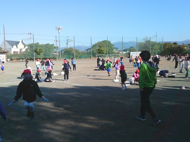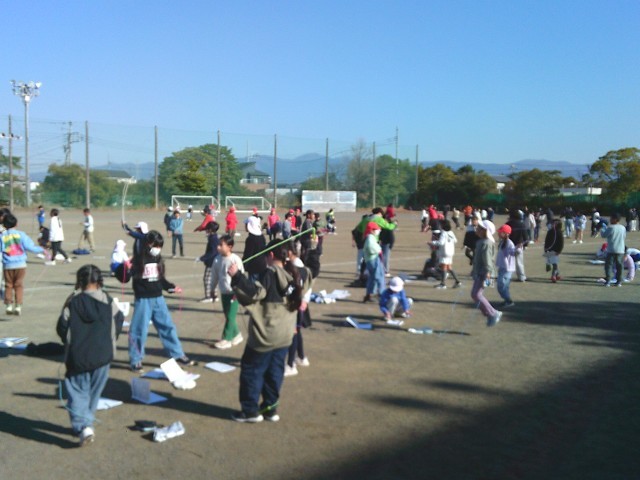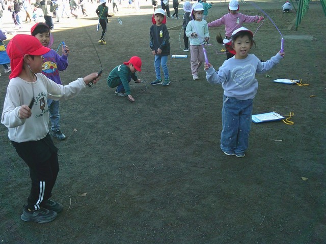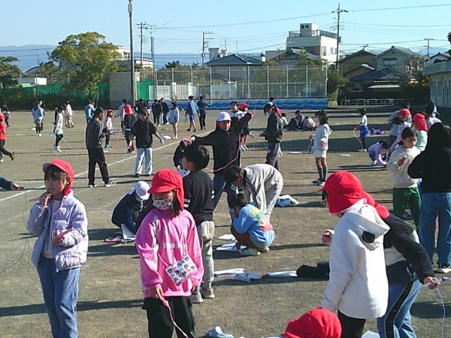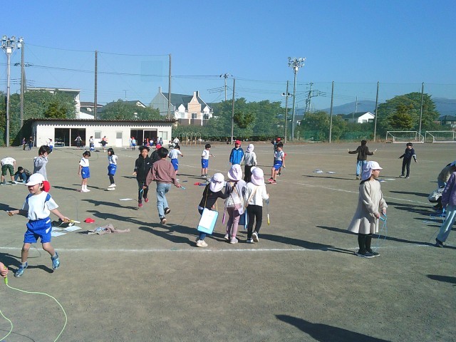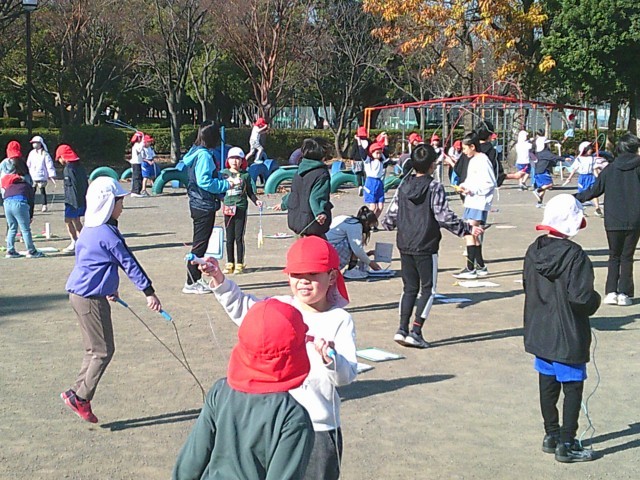 今日から本格的になわとび運動が始まりました。子供たちは休み時間にグラウンドに出て、みんなで声かけをしながらなわとびを行っていました。