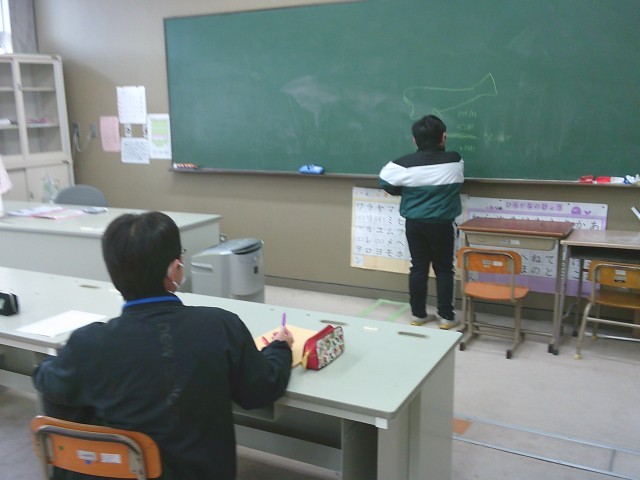 国際室での学習の様子です。日本語指導教員が個々の段階に合わせ、学習支援を行っています。国語や算数では学習プリントを使いながら定着を図っています。