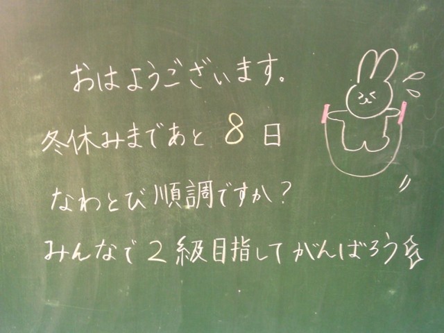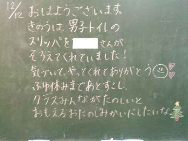 学級担任が黒板メッセージを用意して、子供たちの登校を待ちます。トイレのスリッパを片付けてくれる子を称揚しています。