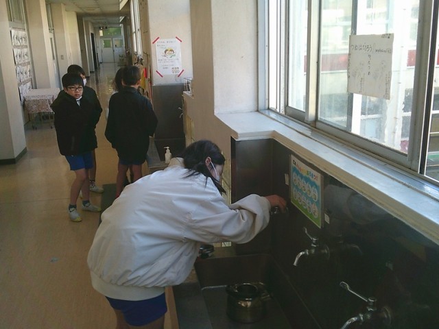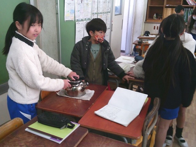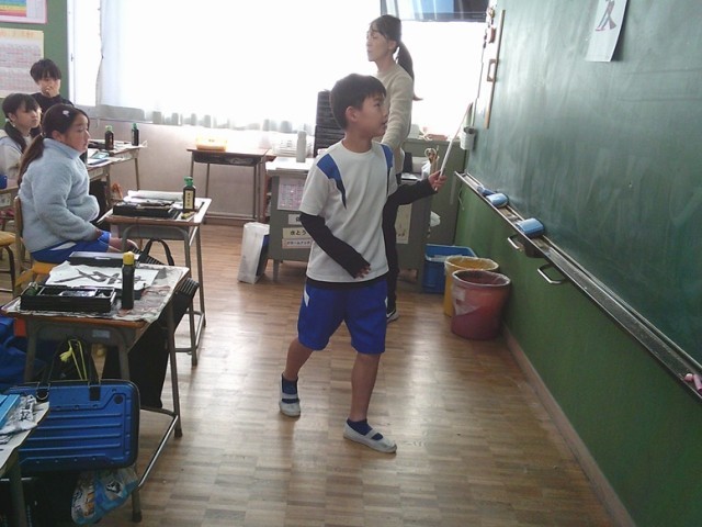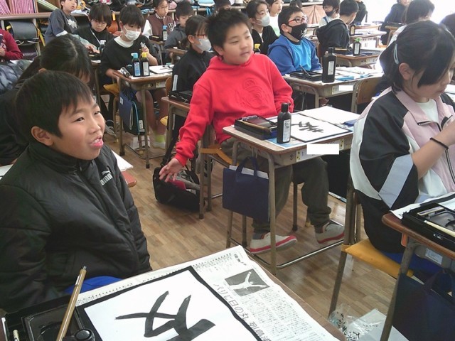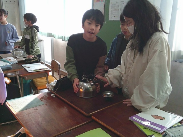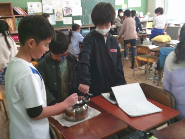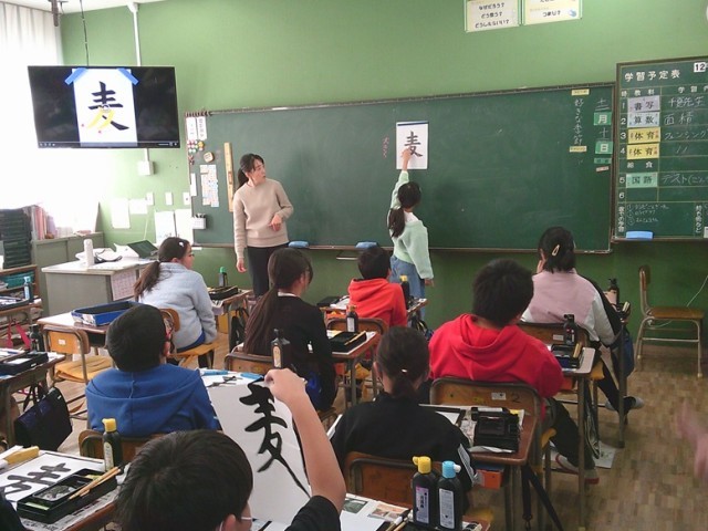 4年生の学習の様子です。両クラスとも意欲的に学習を進めていました。算数では「やかんで1リットルぴったりゲーム」をグループで協力しながら進めていました。書き方の時間には、毛筆で「麦」という字を視写しました。