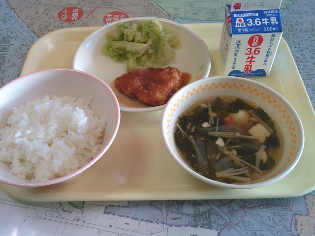 今日の給食は、「ご飯、牛乳、チキンソースかつ、キャベツソテー、わかめスープ」でした。みんなで美味しくいただきました。