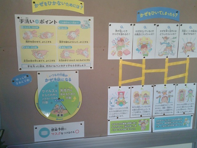 保健室前の壁には、「かぜをひかないためには」という掲示があります。洗いのポイントやかぜ予防について、養護教諭によってまとめられています。