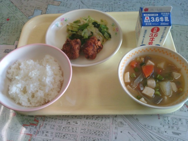 今日の給食は、「ご飯、牛乳、鶏肉の塩麹唐揚げ、ごま入りおひたし、みそけんちん汁」でした。みんなで美味しくいただきました。2学期の給食は今週末で終了です。