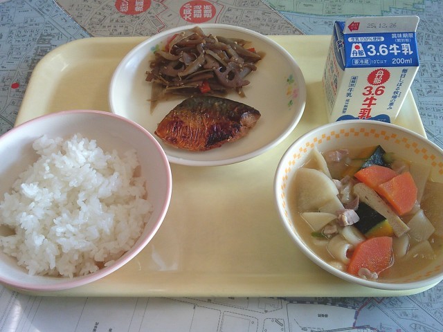 今日の給食は、冬至献立で「ご飯、牛乳、鯖の幽庵焼き、根菜の炒め物、かぼちゃほうとう汁」でした。今年は12月22日が『冬至』です。冬至は、一年の中でもっとも昼の時間が短く、夜の時間が長い日です。この日にかぼちゃを食べると、風邪をひかずに過ごせると言われています。