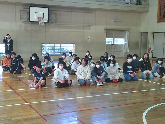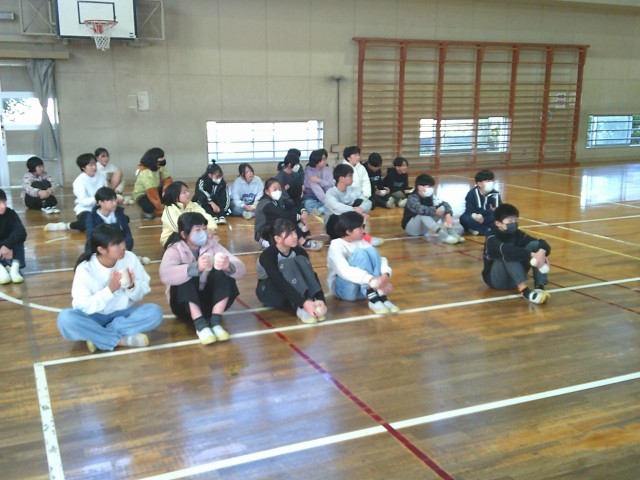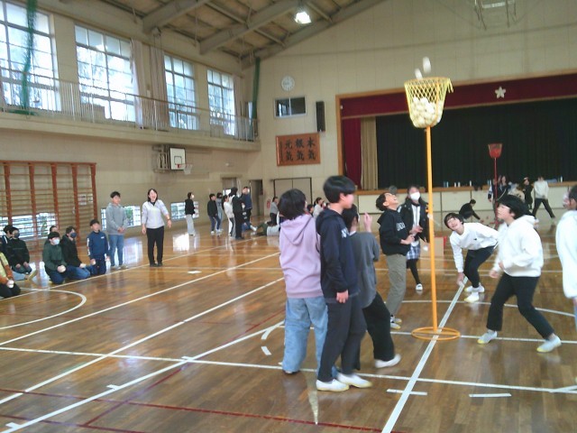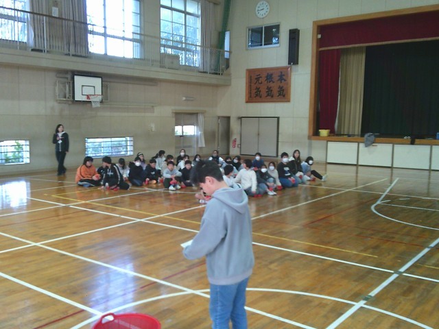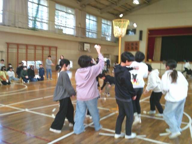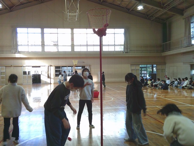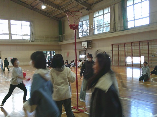 6年生の学習の様子です。体育館において、学年合同でレクリエーションを行っていました。玉入れをクラス対抗で楽しんでいます。