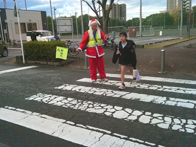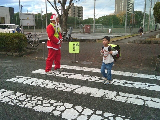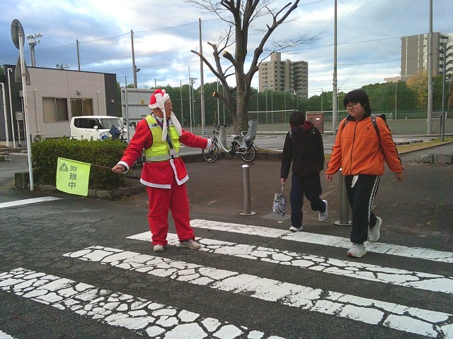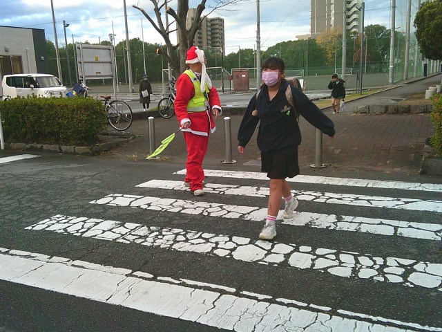 スクールガードの皆様が、交差点のあちらこちらにお立ちいただき、子供たちの登校の様子を見守ってくださっています。サンタクロースのスクールガードさんもおります。本当にありがとうございます。