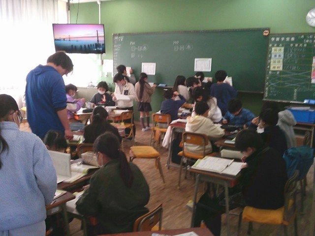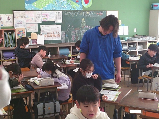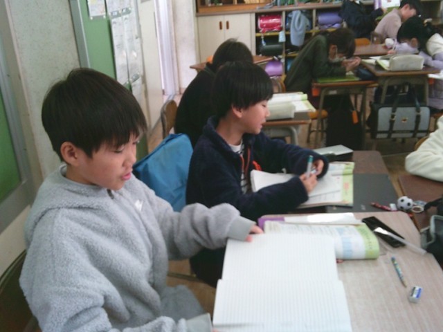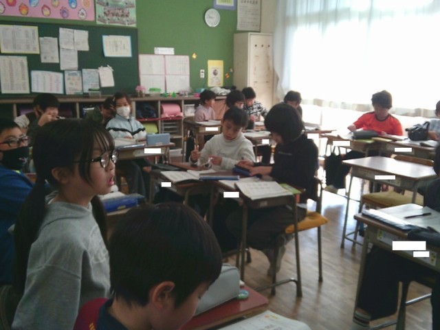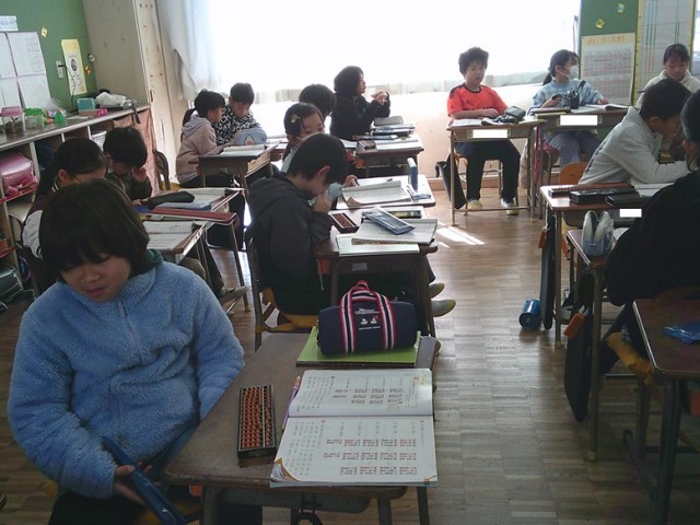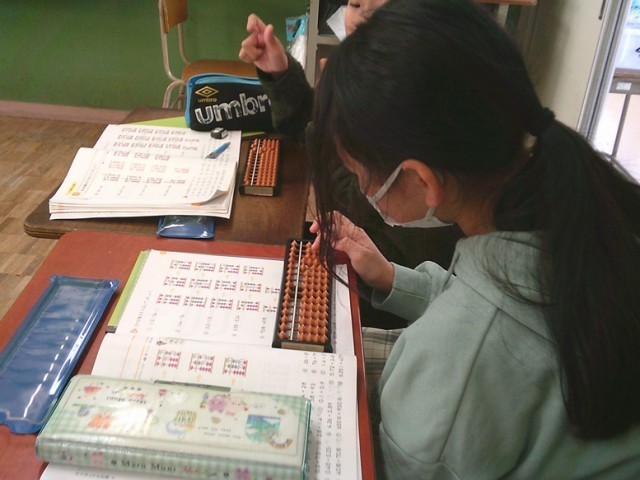4年生の学習の様子です。両クラスで算数の学習を進めていました。演習問題やそろばんの活動を行っていました。、
