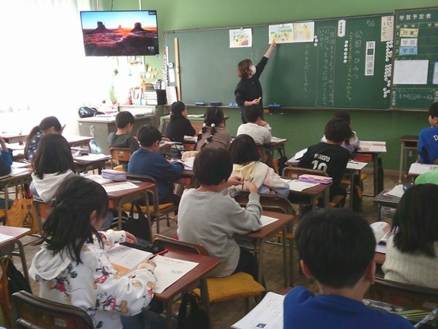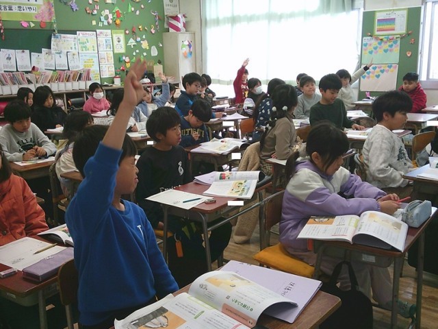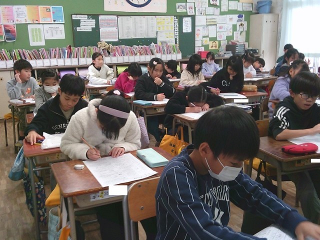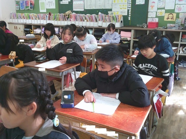 3年生の学習の様子です。両クラスとも落ち着いた雰囲気の中、学習を進めていました。道徳では話し合い活動を、算数では2学期の復習プリントを取り組んでいました。