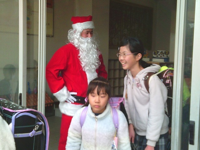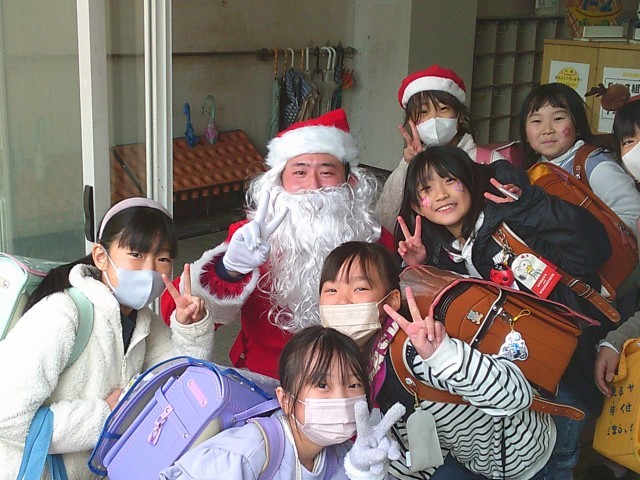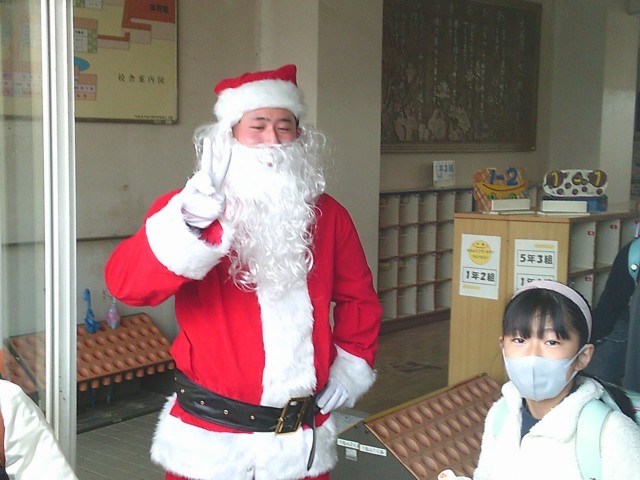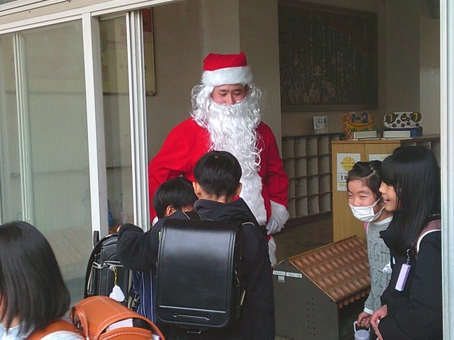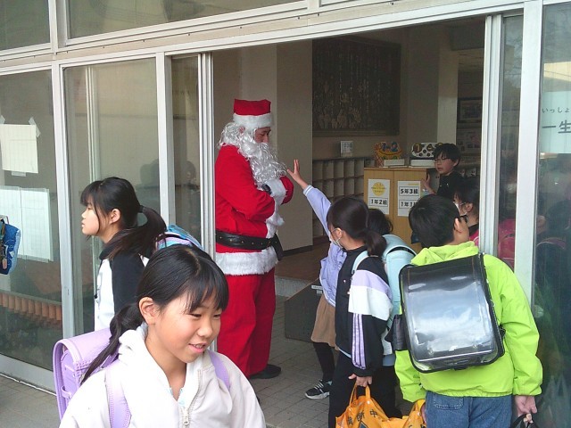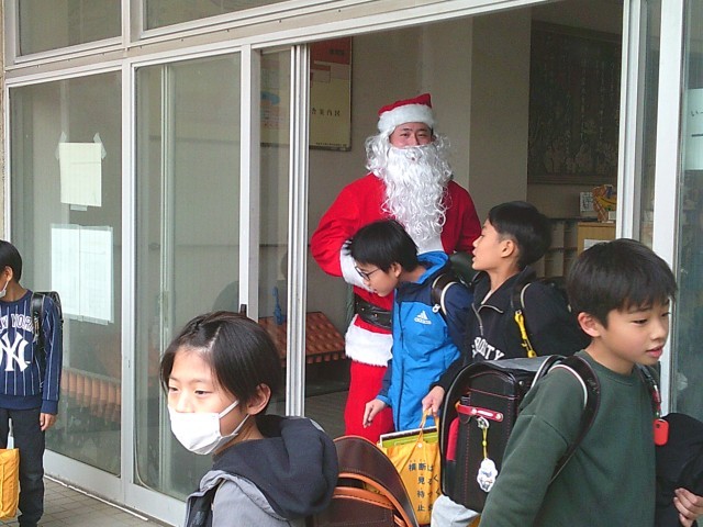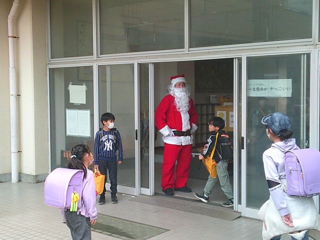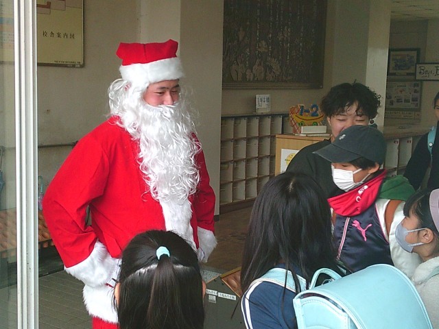 下校時、本校を訪れたサンタさんが子供たちを見送ってくれました。子供たちも「サンタさん、さようなら。また明日。」と言って、帰宅していきました。