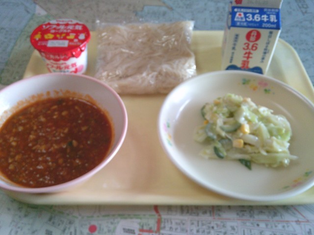 今日の給食は、「ソフト麺(ミートソース)、牛乳、コールスローサラダ、ヨーグルト」でした。みんなで美味しくいただきました。