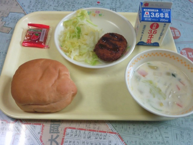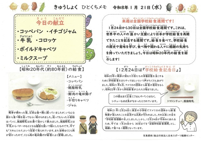 来週は全国学校給食週間です。今日は、その週間に合わせ、約80年前の給食を再現してみました。献立は、「二つ折りパン、牛乳、野菜コロッケ、ボイルドキャベツ、ミルクスープ、いちごジャム」でした。みんなで美味しくいただきました。