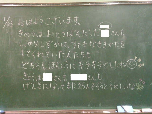 学級担任が黒板メッセージを用意して、子供たちの登校を待ちます。
