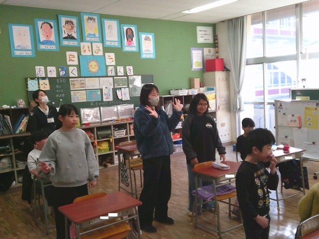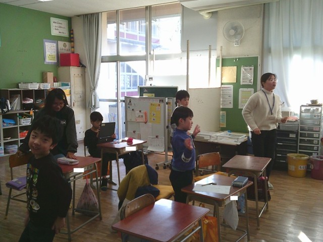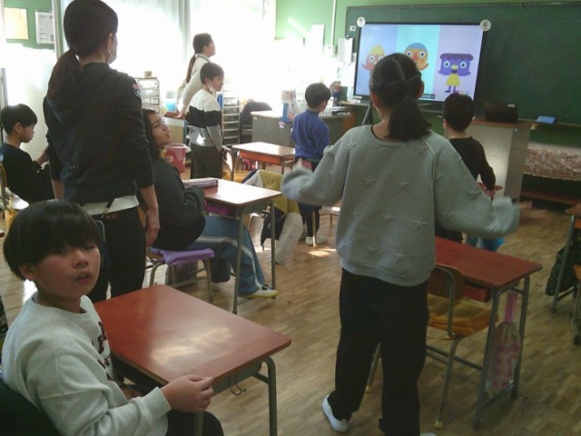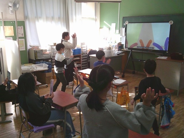 ききょう組の学習の様子です。両クラス合同で英語の学習を進めていました。ALTと一緒に英語の歌を楽しんでいました。