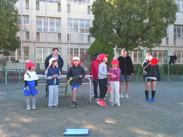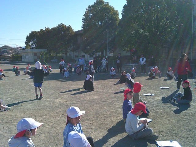 体育委員会の主催で、なわとび持久跳び大会(1・2年)を実施しました。体育委員の号令で持久跳びが始まり、誰が長く跳ぶのかチャンピオンを決めました。長い時間跳んだ子たちに、体育委員が大きな拍手で称揚しました。