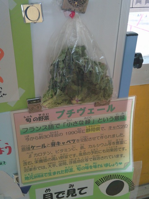 今日の給食にプチヴェールが出ました。プチヴェールは、この季節に沼津市でもたくさん栽培されている旬の野菜です。