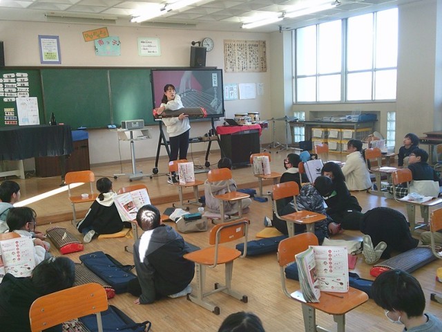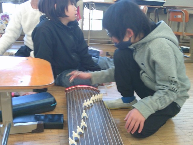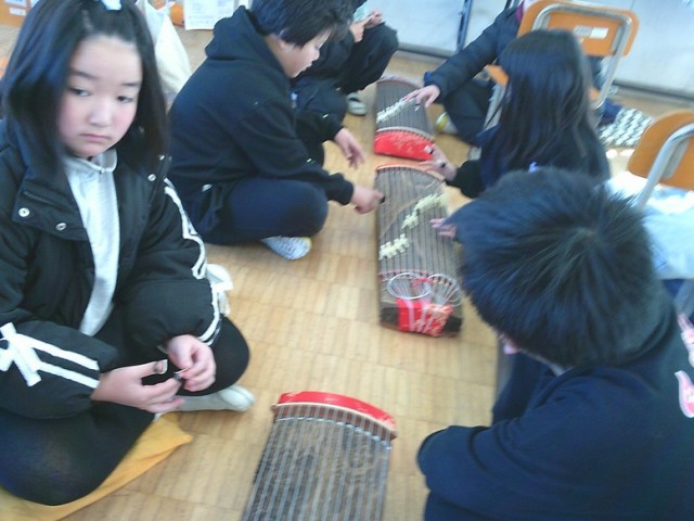 4年生の学習の様子です。両クラスとも集中して学習に取り組んでいました。音楽では和楽器に触れ、みんなで音色を奏でました。